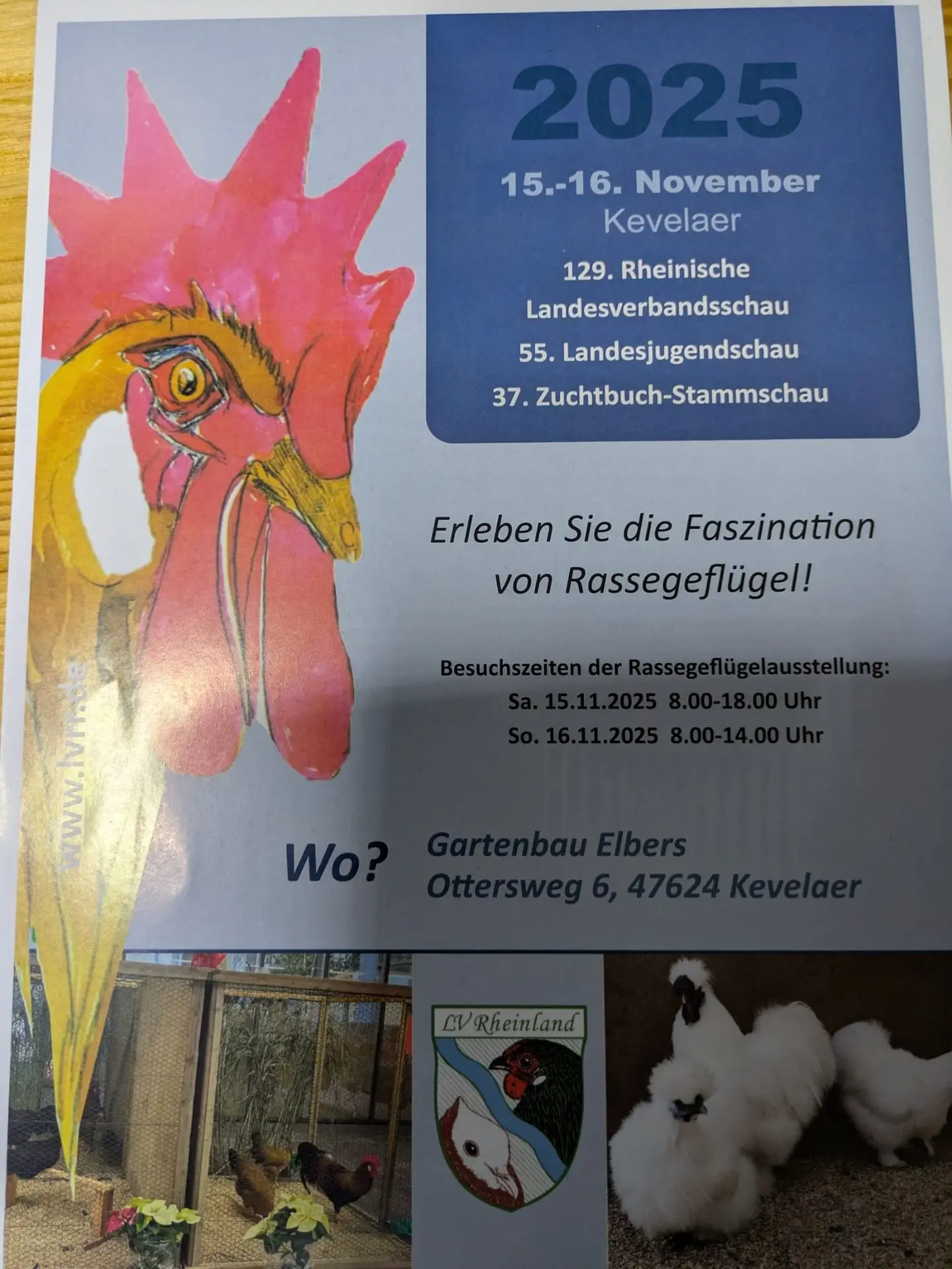 Am Samstag 18.10.2025 ab 10:00 Uhr in der Sülzberghalle Klosterstr.2 Much ist es wieder soweit! Bis Sonntag 19.10.2025 bis 14:00 Uhr präsentieren wir Euch die 46. Mucher Rasse- und Ziergeflügelschau mit vielen züchterischen Highlights und Seltenheiten.