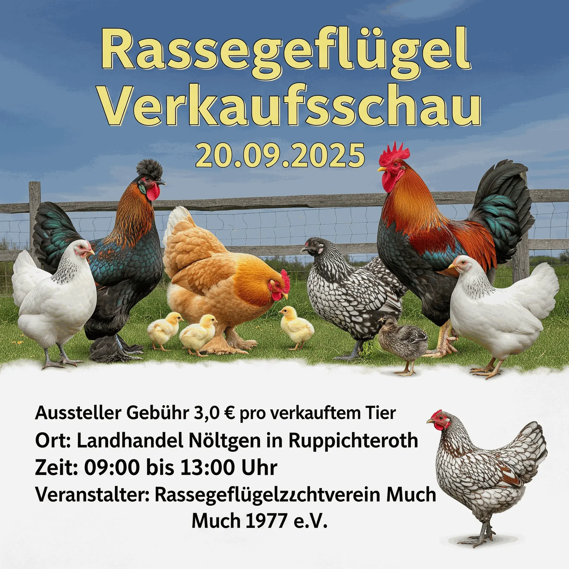 📍 Ort: Ausstellungsgelände des Hühnerclub-Much in Ruppichteroth bei der Fa. Nöltgen 🕘 Zeit: 9:00 – 13:00 Uhr 🎟️ Eintritt frei!
